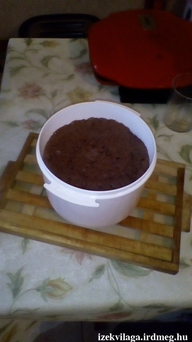 Csak összekevertem a hozzávalókat és egy mikrózható műanyagba ( ételhordó) tettem. Nincs kenés, sütőpapírozás!!